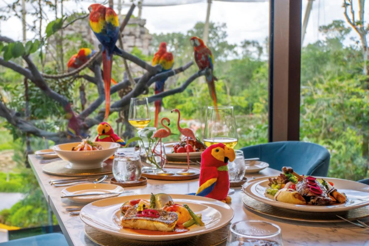 新加坡首創的「鸚『午』之約」,則是深紅餐廳的招牌亮點。這場獨一無二的雙重體驗,旅程由專業飼養員引領,在天空劇場近距離接觸各式五彩繽紛的珍稀鳥類與鸚鵡,聆聽牠們的性格、習性與日常照料,感受與眾不同的互動,並有攝影師為你捕捉與鸚鵡同框的難忘瞬間。隨後移步至餐廳,在風景如畫的壯闊自然景緻環繞中,享用主廚精心設計的四道季節套餐。繽紛鳥類翩然入景,如金剛鸚鵡、琵鷺、美洲紅䴉和美洲紅鶴,看牠們在濕地棲息地中翩翩起舞,為用餐時光增添一抹野趣與驚喜,成就一場獨有的味覺與視覺完美融合的雙重饗宴。