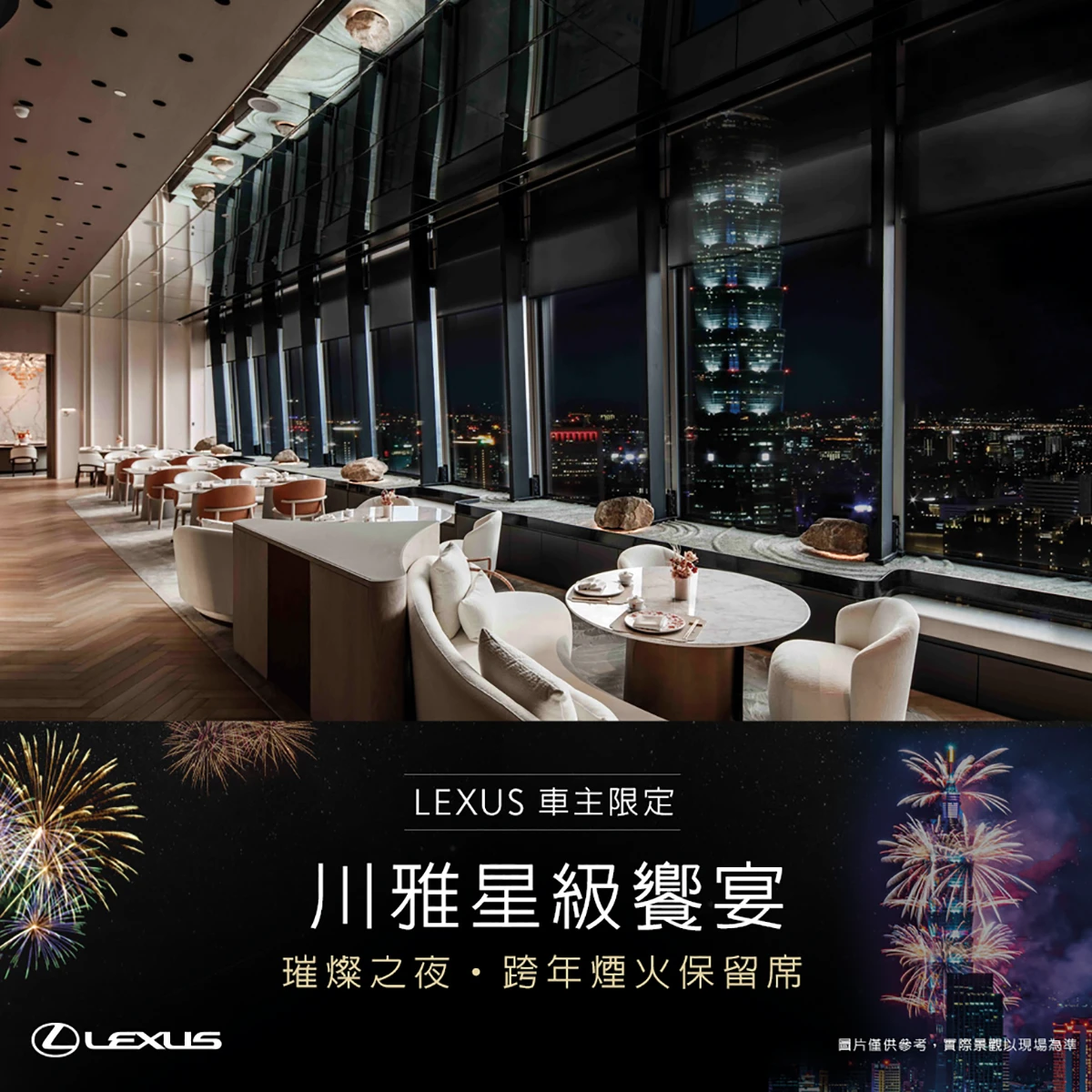 而歲末時,則獻上可以一覽跨年煙火,位於微風南山46樓、2025年首獲一星殊榮的「川雅」。這也是Lexus首次推出的「跨年煙火保留席」,讓車主在距離台北 101 最近的絕佳視角,直擊跨年煙火的璀璨震撼。川雅主廚承襲正宗「蓉派川菜」底蘊,將「二十四味」的傳統辛香,轉化為現代Fine Dining的優雅層次。無論是標誌性的「涼菜九宮格」或細緻的「藿香立鱗魚」,皆體現「一菜一格,百菜百味」的美學。在2025的最後一刻,邀請您以視覺、味覺與嗅覺的沉浸式體驗,在花火與珍饈中,迎接2026的第一道光芒。