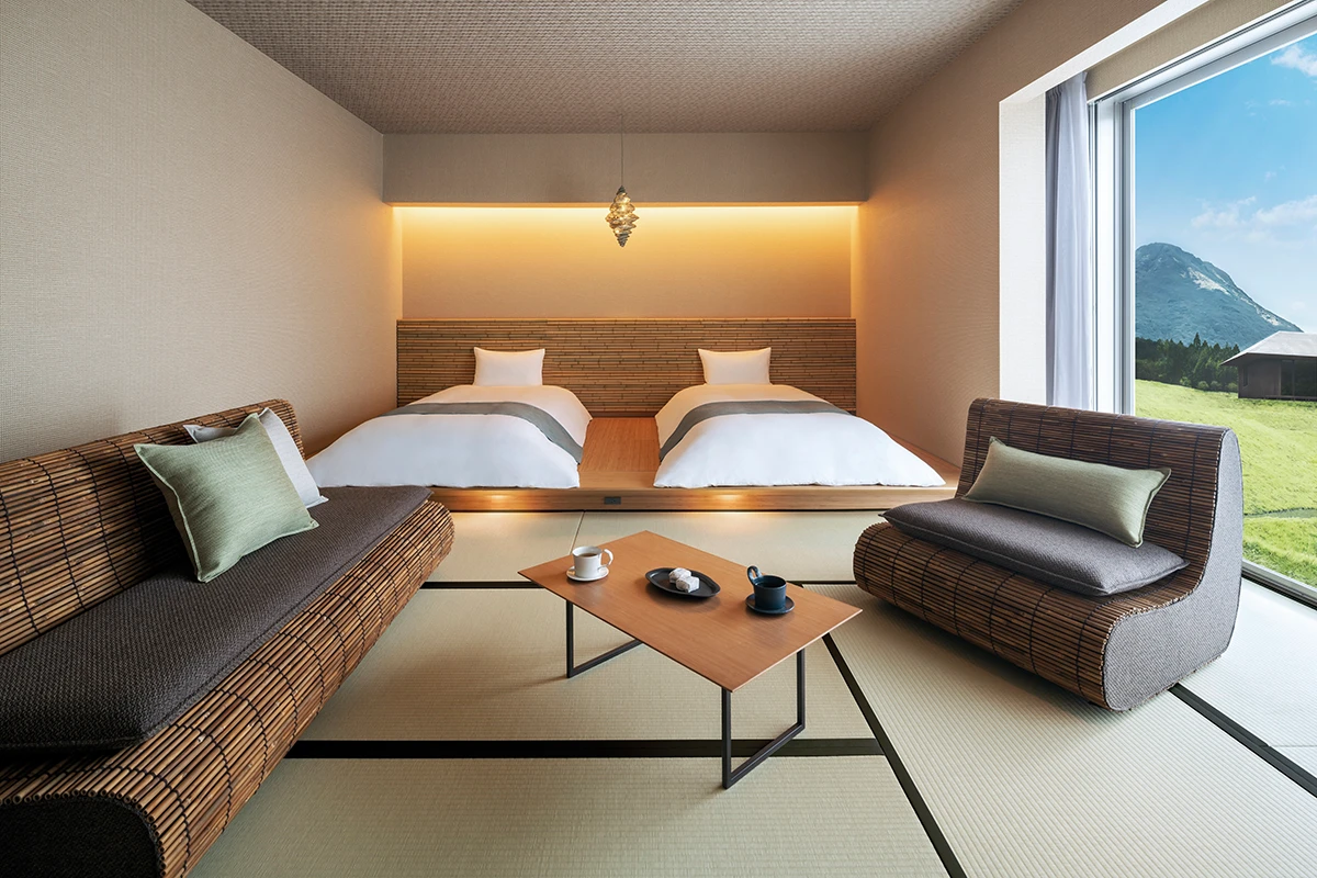 客房設計延續了大分縣的工藝之美,全室榻榻米與燈具皆採用九州稀有的「七島藺」編織而成,一入室便能嗅到淡雅草香;靈感源自夏夜河畔螢火蟲的「螢籠」造型燈飾,則為空間注入了螺旋狀的柔和光影。味蕾的探索同樣精彩,以當地特有的野味料理為主角,搭配四季旬鮮,呈現出充滿在地風土的精緻會席。而由布院溫泉擁有高居日本第二的豐沛湧泉量,富含對肌膚溫和的偏矽酸,觸感柔滑細緻,是極佳的「美肌之湯」。身處露天風呂,仰望遼闊天際,遠眺由布岳的壯麗山容,是所有感官的極致享受。春耕、夏綠、秋金、冬藏,梯田映照的山色在窗前流轉,這裡不僅是一處旅宿,更是一方安頓心靈、與天地對話的療癒聖地。