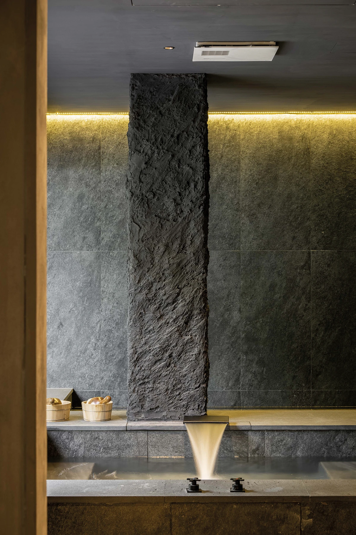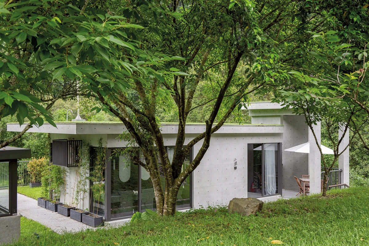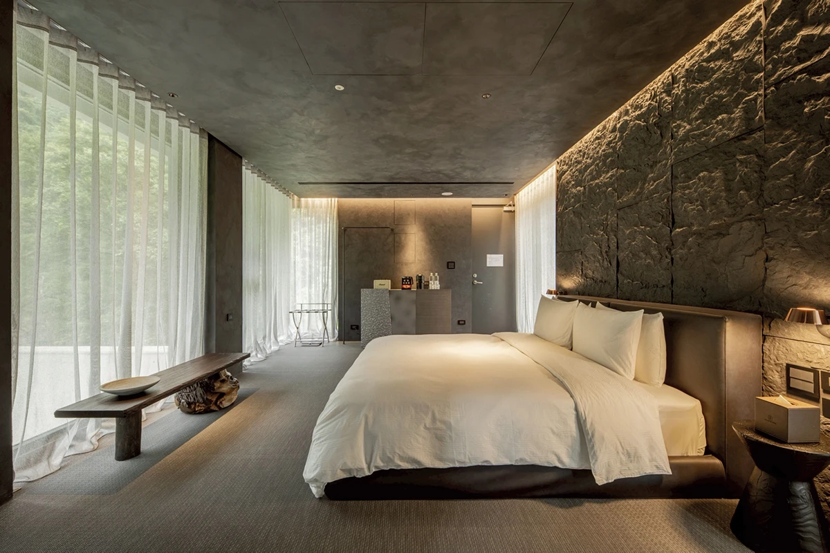 隱於礁溪五峰旗風景區的山巒層疊間,呆水溫泉耗時7年、由建築大師毛森江團隊精心打造。建築主體以洗鍊的清水模為骨架,揉合與自然共生的溫潤原木與粗獷石材,將日式侘寂美學淋漓演繹。灰階的幾何牆面與大片落地窗外的綠意光影相互交織,構築出一方清雅、靜謐的無壓場域。「今日無事,最宜呆水戲泉」,邀請旅人放下繁雜、在山水中練習「放空」的生活哲學。