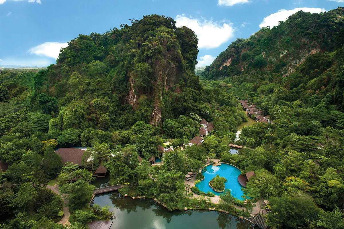 座落於歷史底蘊深厚的馬來西亞怡保,班加蘭溫泉度假村(The Banjaran Hotsprings Retreat) 是一處被時光封存的避世聖地。隱身於巍峨的石灰岩山丘與天然地熱溫泉懷抱之中,這裡蒸騰的熱氣與晨間薄霧在鬱蔥山巒間交織繚繞,彷彿為旅人開啟了一場回歸內在的淨化儀式。