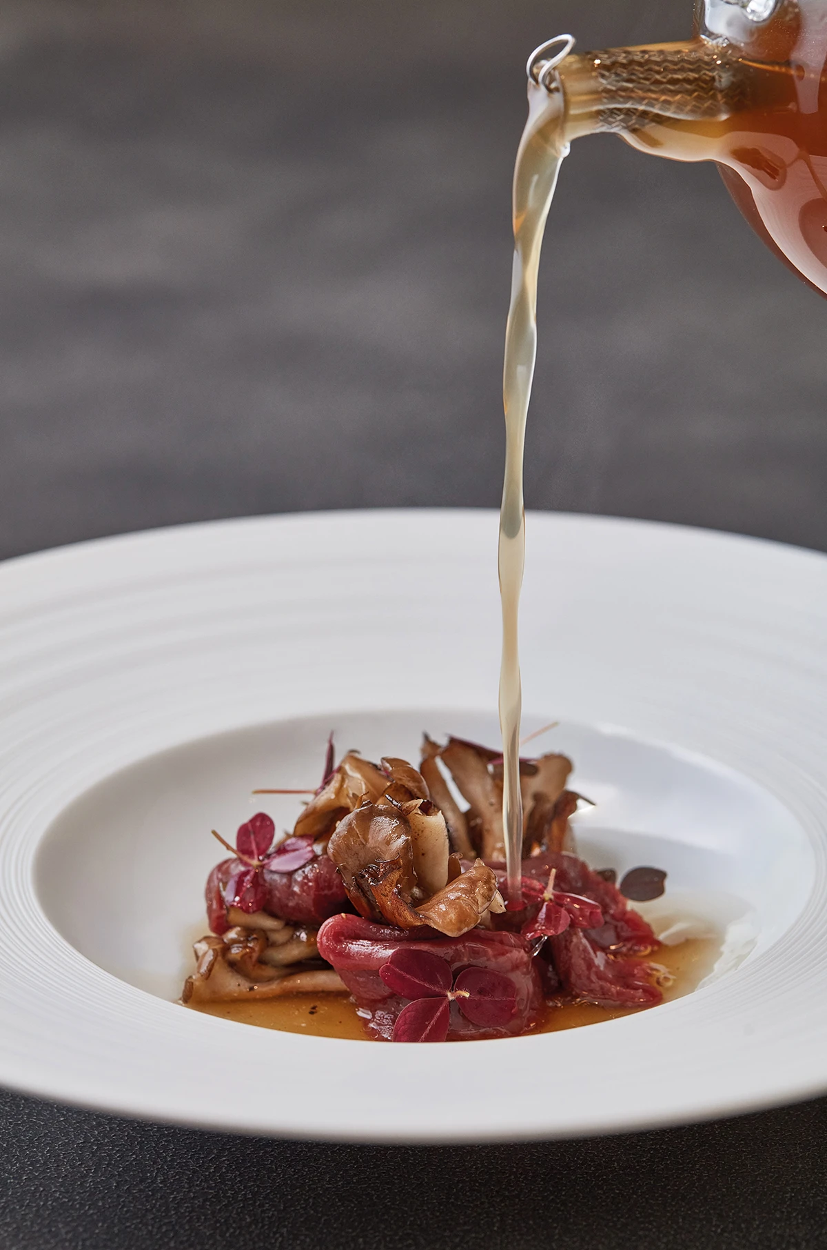 主廚深信每種食材皆有其存在的必然,絕非僅是盤中點綴。開放式的板前座位宛如劇場的第一排搖滾區,從火候掌控、醬汁濃淡到最後的擺盤收尾,主廚的每一個動作,皆如揮灑於畫布上的精準筆觸。他對法式料理的靈魂——醬汁尤為執著,追求高湯煉製的極致純淨,並以此延伸出充滿想像的細膩風味。他大膽解構台灣經典的「佛跳牆」,將炙烤舞菇與鹿肉菲力薄片置於盤中,再緩緩注入熱湯,讓香氣層層推開,餘韻深長;或以法式洋蔥湯為靈感,將傳統的焗烤葛瑞爾起司轉化為修道士頭起司泡芙,在法菜與在地記憶之間尋找完美平衡。板前流暢的動線讓用餐宛如一場五感即興秀,透過細節堆疊與持續挑戰,為傳統法式料理注入了台灣風土的溫潤靈魂。