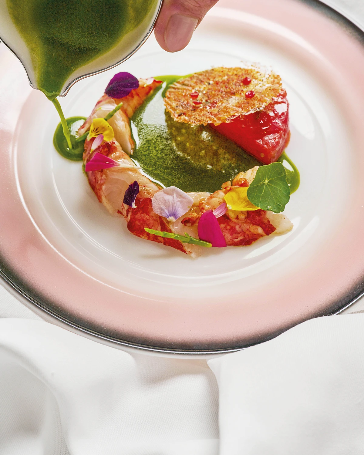 然而,真正讓味蕾行家心醉的,並非三星光環,而是主廚對「食材供應鏈」的極致掌控與傳統技法的堅持。Lepinoy 與全球頂級供應商建立深厚信賴,以季節為軸,將每道料理視為藝術品般精雕細琢。他捨棄浮誇的擺盤,專注於醬汁的層次堆疊,使其成為味覺的靈魂。料理風格純淨而深邃,例如以布列塔尼藍龍蝦佐特級初榨橄欖油,或以帝王蟹結合魚子醬、酸蘋果丁。大量使用法國空運食材,同時也精準選用亞洲頂級鮮味,在正統法式技法中展現對風土的敏銳度,每一口都是經過反覆淬鍊的極致工藝。於此用餐,你能深刻感受到法式料理的精髓:在醬汁的濃淡間體會技法節奏,在火候掌控中讀出主廚的剛毅性格。這份對正統法式料理的精準演繹、穩定品質與崇高敬意,正是 Les Amis 多年來在亞洲餐飲界屹立不搖的雋永價值。