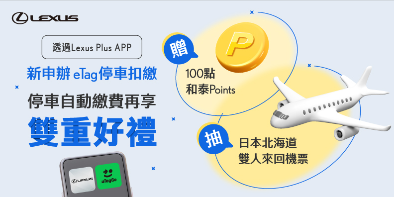 l 適用對象:和泰集團會員(Lexus車主)從「Lexus Plus APP」中,前往開通eTag停車扣繳服務的新申辦用戶(限LEXUS車牌)
