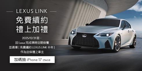 車輛安裝T-BOX (LEXUS LINK)功能,且於活動期間回 Lexus 服務廠完成準時定期保養,並選擇「續約 LEXUS LINK 半年」作為定保禮者,即可獲得抽獎資格。(每輛車號於活動期間僅限一次抽獎機會)