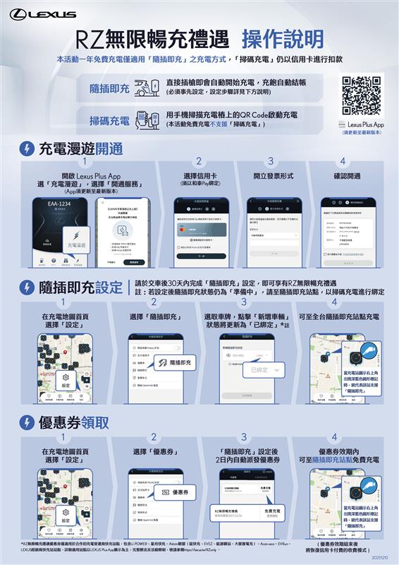即日起至 2026年 1 月 31 日(含)前向和泰汽車股份有限公司之授權經銷商訂購 RZ車款之車主*1(以下簡稱用戶),完成綁定步驟即享一年不限行駛里程的免費充電服務。