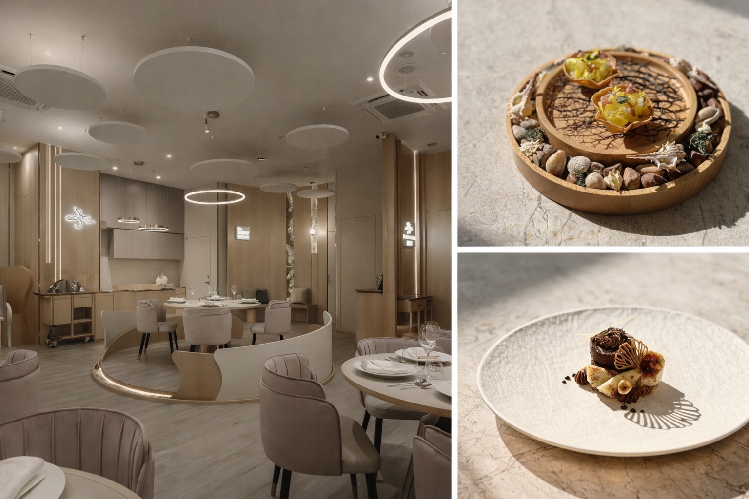 暖杏色調與圓弧吊燈構築出舒適而優雅的用餐場域,搭配細膩呈現的料理細節,展現主廚蔡中和與經理陳玉錡對顧客體驗的一致講究。