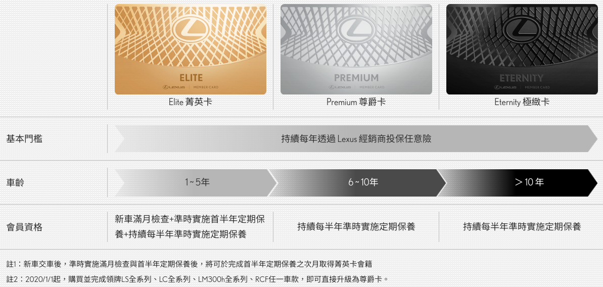 購買以下任一車款*並完成領牌之車主凡完成滿月回廠檢查及首半年定期保養並透過 Lexus 經銷商通路投保任意險之車主,方可取得資格。(其他條件與尊爵卡規定相同)